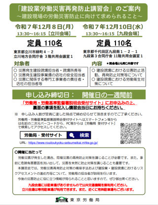 建設業の休業災害発生工事現場等を対象とした、同種災害の再発防止に向けた取り組み等にかかる説明会となります。