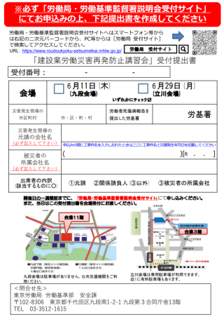 当日ご持参いただく、「建設業労働災害再発防止講習会」受付提出書の